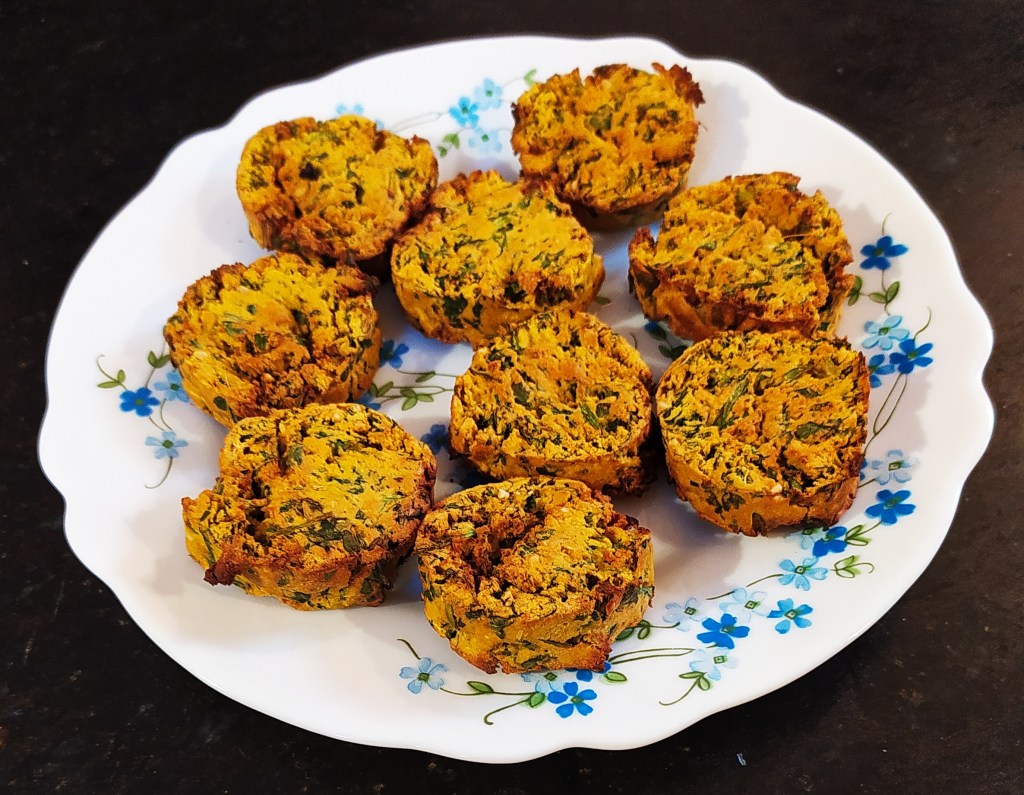 Tea-time snacks are always quite difficult on a WFPB diet. There are several, but one soon gets bored with them. Every time I make a new discovery, I am delighted and immediately try it out. This Maharashtrian Kothimbir Vadi is one such dish. Made of besan (chickpea flour, kadalai mavu), coriander and spices, it tastes delightful. But like most Indian snacks, this is also deep-fried. The challenge is always to prepare these dishes without oil, and no compromise on taste. Thankfully, this dish did not pose such a challenge. It turned out perfectly in the first attempt!