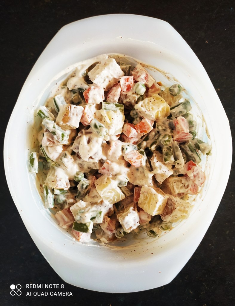 I have heard of Russian salad, but it has never been top-of-mind. It always sat on the edges of my memory. As my experiments with salads continued, this salad popped up in my mind. What a happy happenstance – it was a delightful recipe. Of course, I modified it using vegetables that I had on hand. And avoided the cream – so, strictly it is not Russian salad. But it came pretty close. The beauty is that it takes no time to prepare at all – except for the cutting and chopping. And that, in many instances, can be therapeutic.