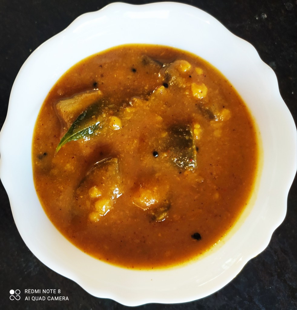 A note on the vegetables to be used. There are several vegetables that can be used in sambar, either singly or in combination. The one with a medley of vegetables is called kadambam (meaning medley). This is mostly prepared on festive occasions or when guests are to be served. For day-to-day purposes, only a single vegetable is used. When only a single vegetable is used, then the flavour of the vegetable is imparted to the sambar. An eggplant sambar tastes quite different from a drumstick sambar. I largely prefer the single vegetable version. In the recipe presented here, I have used the small, round eggplant.