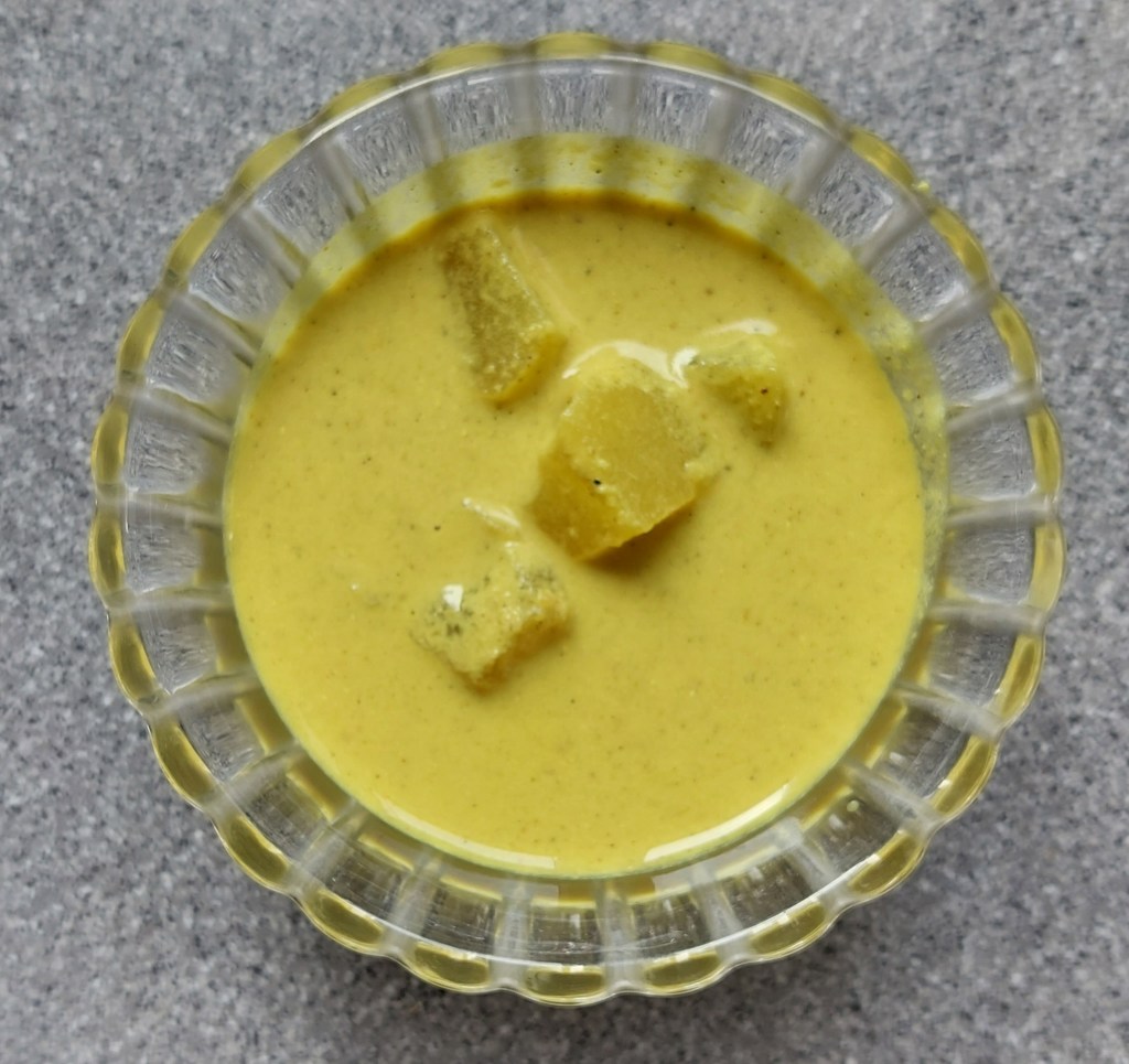 I love yogurt based dishes in any form. Of course, I have been having the Palakkad mor kootan (curry in a yogurt base) since childhood. But it is only after moving to Delhi about 38 years ago that I discovered that almost all states in India have some form of a dish with a yogurt base. I became very fond of the Punjabi kadhi and would make it regularly. When I turned vegan and WFPB about a decade ago, I was delighted that this dish could still be make using vegan yogurt – with no difference in taste whatsoever. As also so with the Palakkad mor kootans. Some years ago, I decided to research the different kinds of yogurt based ‘dals’ in the country – and was delighted with the variety available – except in most states of East India. I ran a series of these recipes on Facebook. Today, my post is on the very Palakkad/Kerala/Thamizhnadu dish using ash gourd in a yogurt base. You can also use pumpkin, raw banana, carrots, yam, Chinese potatoes. chayote squash or colocassia to prepare this dish.