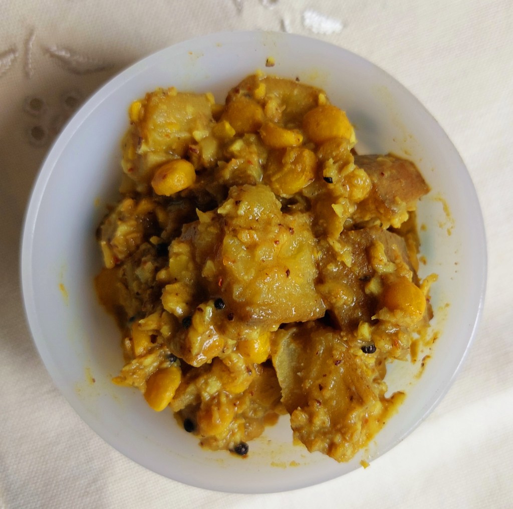 Another recipe from the Tirunelveli region of Thamizhnadu. This time, a curry using raw bananas. Raw banana is never used in North Indian cuisine. But I do buy it every week as it is one of my favourite vegetables. Since North India is bereft of it, there are no recipes from this region. So, I invariably fall back upon the South Indian recipes that I know. These include podimas, thoran, mezhukkuperatti and some kootans (wet dishes to be mixed with rice). I also make raw banana vadai (like cutlets) or kurkure (mashed and coated with ground beaten rice). So, there are several dishes that you can prepare with this tasty and versatile vegetable. But I have never heard of raw banana kootu (a slight moist curry preparation). So, I was intrigues and decided to try it. Needless to say, it was so good that I now have one more raw banana recipe to add to my repertoire