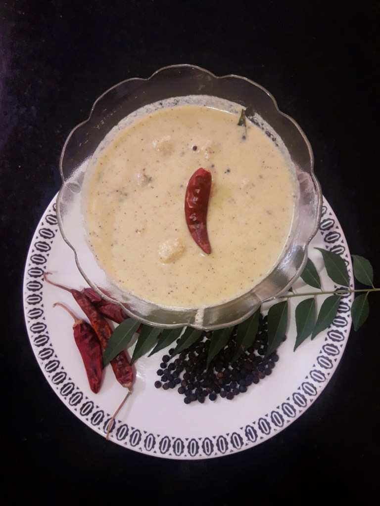 This dish has a very appealing and unique taste. It is mildly spiced. As it uses yogurt as a base, It hardly gives any indication of being spicy except for a flavour of black pepper. Straight from the heart of Kerala, it is a dish that no sadya (feast) is complete without. Do try it and add another a unique taste to your repertoire of tongue ticklers.