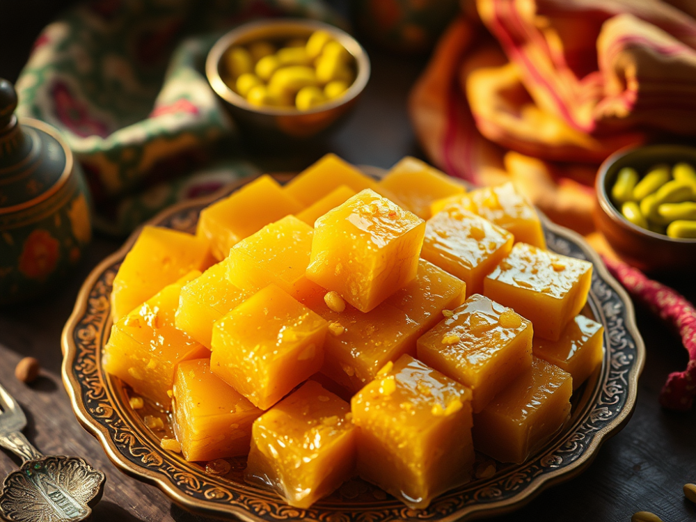 A WFPB (Whole-Food Plant-Based) version of Karachi Halwa is a healthier twist on the traditional sweet, made without refined sugar, oil, or ghee, and focuses on whole, plant-based ingredients. This version might use alternatives like dates or coconut sugar for sweetness and arrowroot or tapioca starch for the jelly-like texture. Coconut milk or almond milk could replace ghee to add richness, while the halwa is still flavored with cardamom and garnished with nuts or seeds.The WFPB Karachi Halwa retains the classic chewy, jelly-like consistency but has a more subtle sweetness compared to the traditional version. The use of whole-food sweeteners gives it a natural flavor, with hints of caramel from dates or a light coconut flavor if coconut milk is used. It’s a slightly healthier but satisfying alternative, maintaining the signature nutty crunch from cashews or pistachios.iKarachi Halwa originated in Karachi (now in Pakistan) and is also known as Bombay Halwa in India. The halwa’s popularity spread throughout the Indian subcontinent, particularly among the Sindhi community. It’s often a festive treat, given as a gift during festivals like Diwali. Its unique, glossy appearance and firm, chewy texture make it a standout in the diverse world of South Asian sweets.