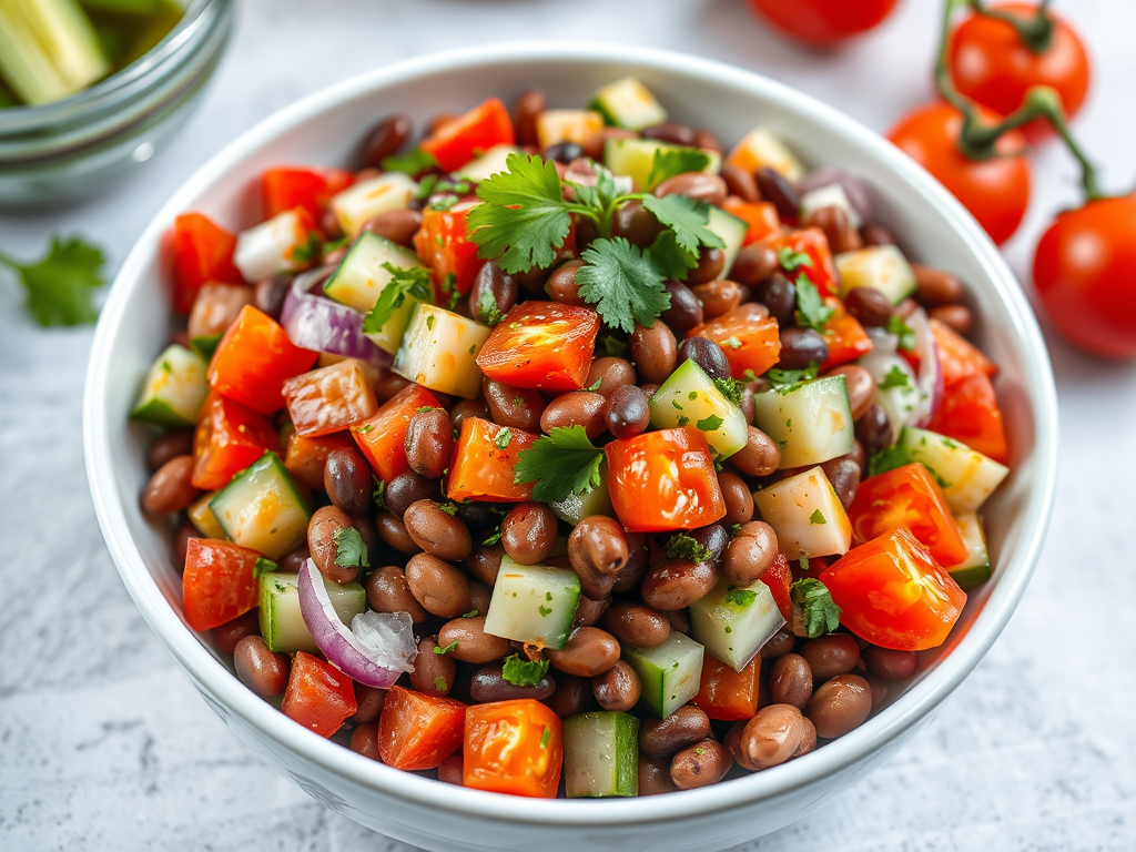 A whole food, plant-based (WFPB) kidney bean salad is a flavorful and nutrient-dense dish that perfectly aligns with a healthy lifestyle. Made with boiled kidney beans, diced cucumbers, tomatoes, red onions, and bell peppers, it offers a refreshing mix of textures and flavors. Fresh herbs like cilantro or parsley enhance its taste, while a simple WFPB dressing of lemon juice, balsamic vinegar, and a touch of mustard adds zest without any processed oils. This salad is not only satisfying but also packed with essential nutrients. Kidney beans are an excellent source of plant-based protein and fiber, which promote satiety, improve digestion, and support gut health. They have a low glycemic index, making them beneficial for blood sugar control, and they are rich in iron, magnesium, and antioxidants that support heart health. Including this oil-free, wholesome kidney bean salad in your diet is a delicious way to enjoy plant-based nutrition while staying full and energized.