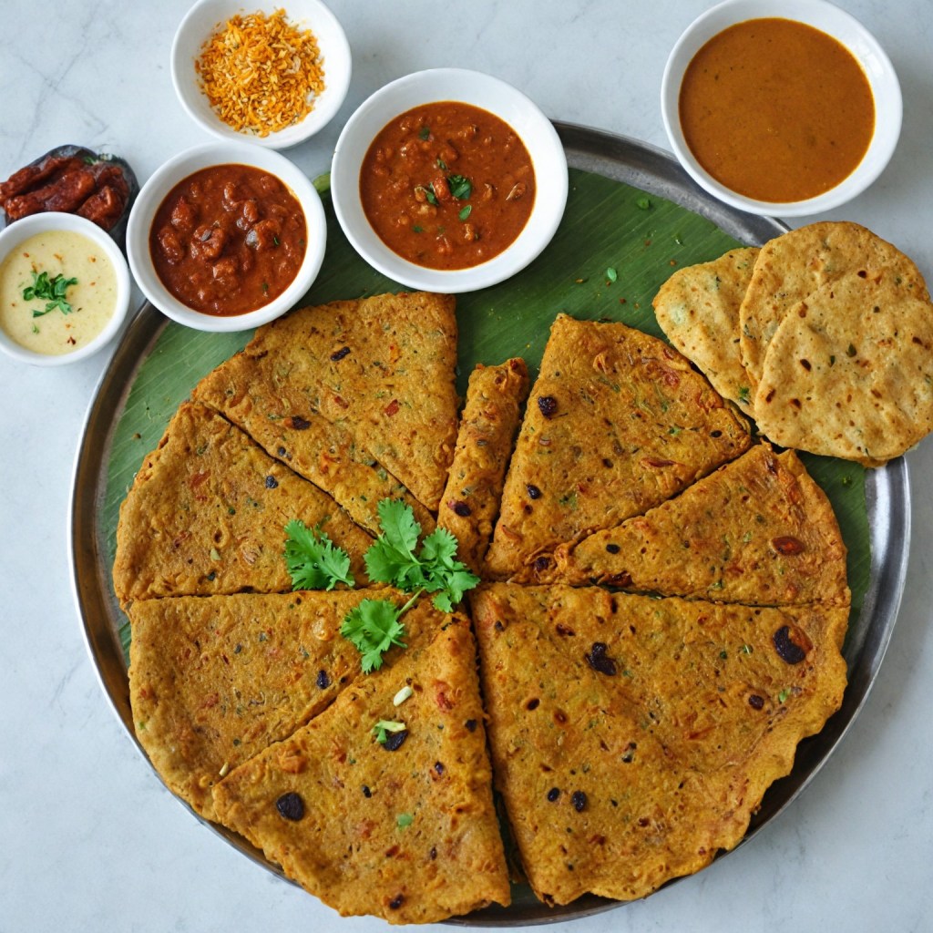 Thalipeeth, a beloved Maharashtrian flatbread, can be made fully Whole-Food Plant-Based (WFPB) without losing its traditional charm. The base is bhajani, a multigrain flour mix usually containing roasted sorghum (jowar), pearl millet (bajra), rice, wheat, and lentils like chana dal and urad dal. For a WFPB version, the flours are simply combined without oil or ghee, kneaded into a soft dough with water, onions, coriander, green chilies, cumin, and seasonal vegetables such as grated bottle gourd, pumpkin, or cucumber for natural moisture. The dough is patted into rustic discs and cooked on a hot cast-iron skillet without oil, relying on a slow roast for a nutty flavor and crisp edges. Traditionally enjoyed at breakfast or as a light meal, WFPB thalipeeth can be paired with plant-based yogurt, spiced lentil chutneys, or fresh thecha made without oil. Wholesome, high in fiber and plant protein, it is a sustaining dish for everyday meals and festive spreads alike.