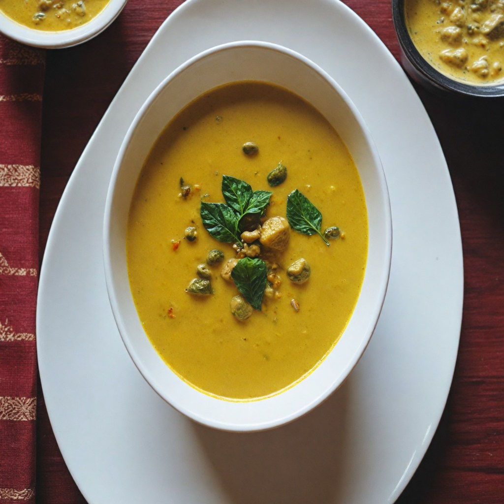 Maharashtrian kadhi can be easily adapted into a whole-food, plant-based (WFPB) version by using homemade plant-based yogurt made from soy, peanut, or cashew milk instead of dairy, and thickening it with chickpea flour (besan). This variation is lighter than the Punjabi kadhi and does not include deep-fried pakoras, making it naturally healthier and more digestible. It is gently flavored with curry leaves, ginger, green chilies, turmeric, and cumin, giving it a soothing aroma and mild spice without any added oil. Rich in plant protein from besan, probiotics from non-dairy yogurt, and antioxidants from spices, it supports gut health, immunity, and digestion. The taste is tangy, smooth, and refreshing, providing a cooling effect when paired with steamed brown rice or millet. In Maharashtra, it is enjoyed both as an everyday comfort food and as part of festive or fasting meals, valued for its simplicity, nutrition, and balanced flavors.