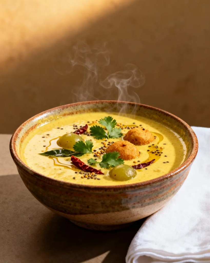 This WFPB Nendra Pazha Puli Pachadi preserves the sweet–tangy harmony of the Kerala classic while remaining completely oil-free and dairy-free. Ripe nendran bananas are gently simmered until soft and naturally caramelised, allowing their deep sweetness to shine without refined sugar, though a little date paste may be added if needed. The characteristic puli comes from diluted tamarind extract and a spoonful of unsweetened plant-based curd such as peanut or cashew yogurt, which lends gentle creaminess and mild sourness. Fresh coconut ground with green chillies and cumin forms a thick, fibre-rich base, and the traditional tempering of mustard seeds, dried red chillies, and curry leaves is dry-roasted or sautéed in water instead of oil to retain authentic flavour. The result is luscious, lightly spiced, softly sweet, and delicately tangy, making it a nourishing, potassium-rich accompaniment to steamed red rice in a wholesome WFPB sadya.